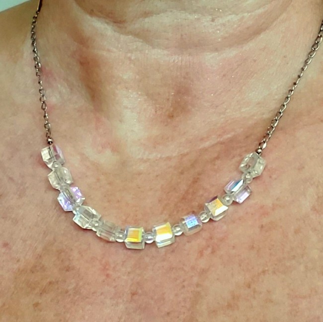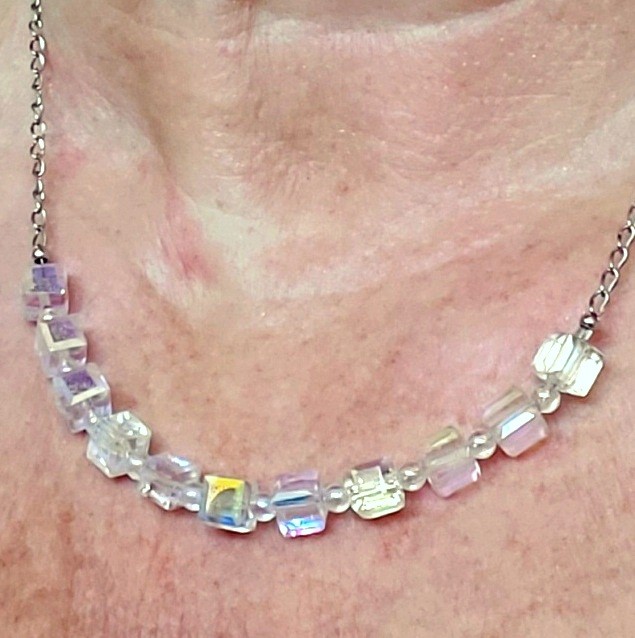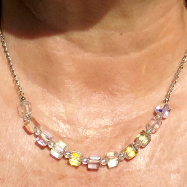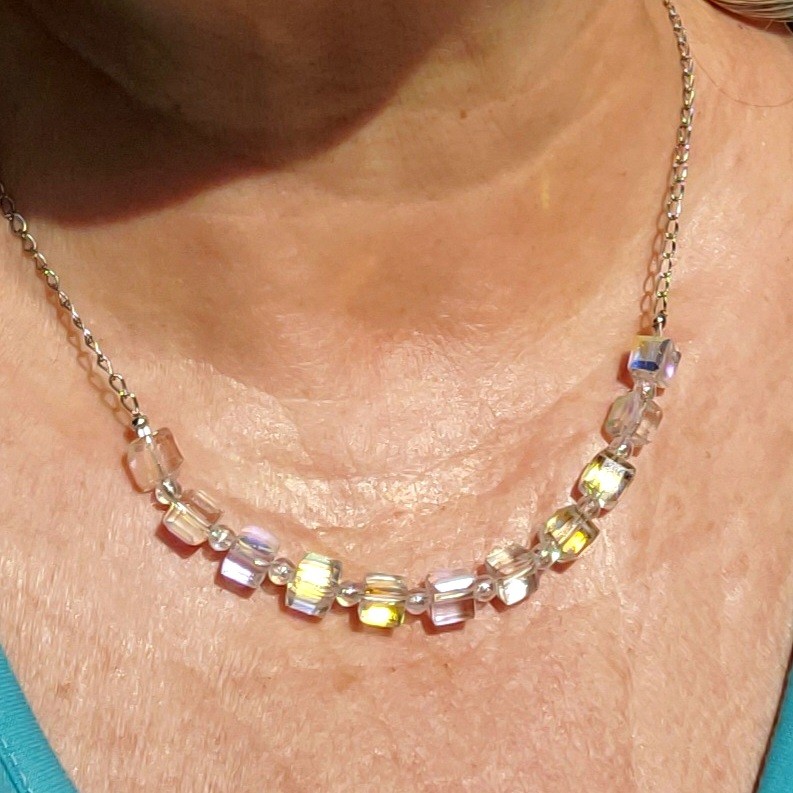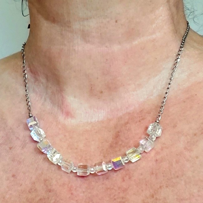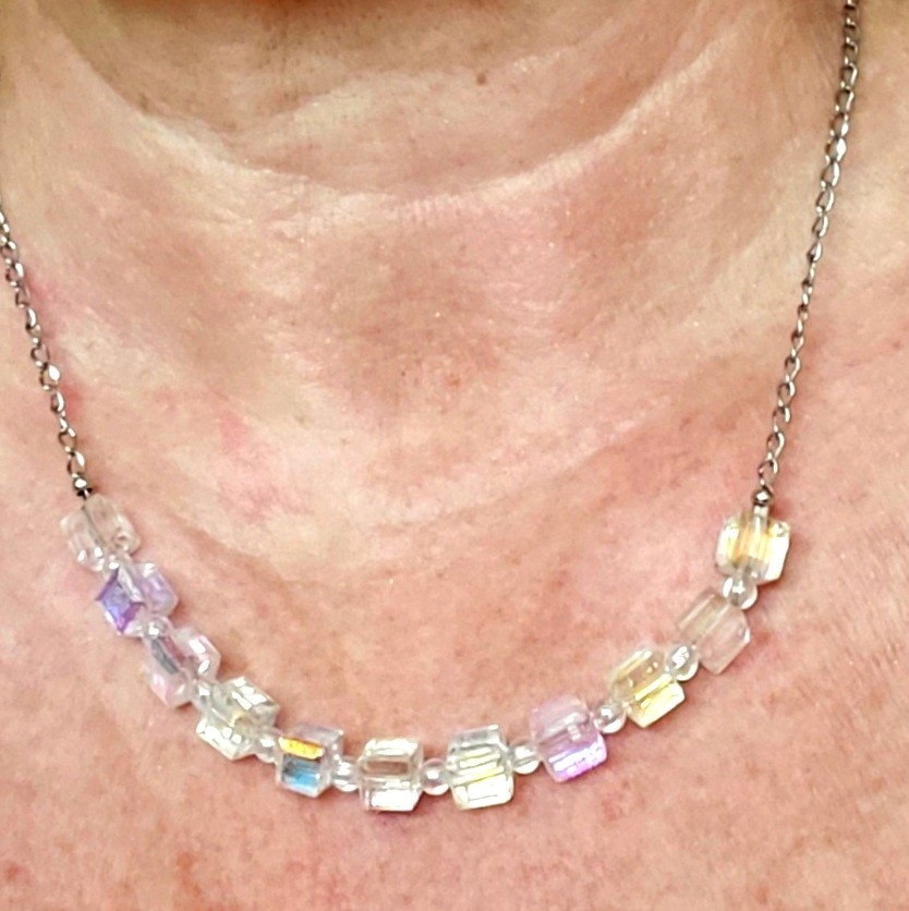 Le Collier Cristalline est réalisé avec 11 perles de 6 mm carrées en cristal transparent aux jolis reflets changeants aux couleurs de l'arc-en-ciel et petites perles intermédiaires en cristal transparent.