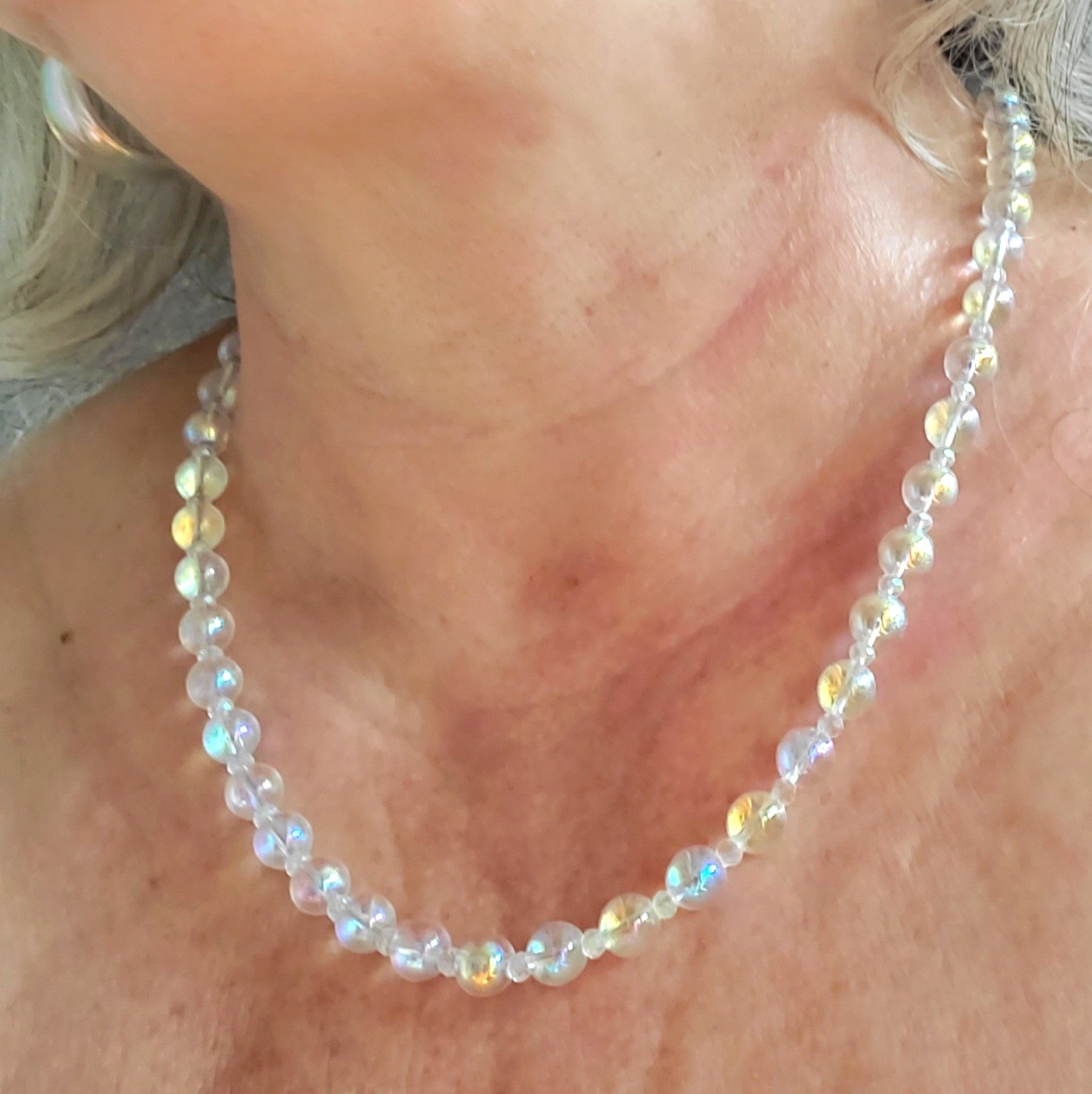 Monté sur fil avec fermoir et chaînette de rallonge en acier (anti-allergique), le Collier Coeur Christal est réalisé en Perles en Cristal de 8 et 3 mm transparentes aux incroyables reflets et couleurs de l'Arc-en-Ciel en inclusion. Elles vibrent inconditionnellement la Lumière et en nourrissent notre intérieur.